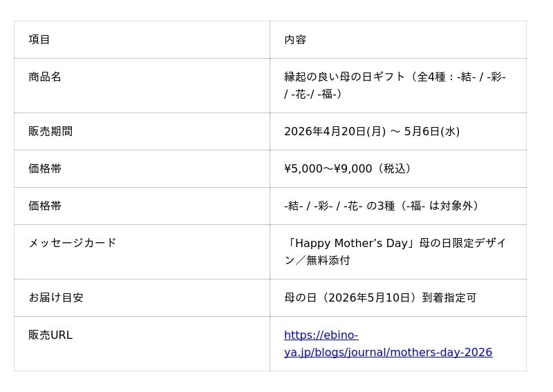 Eギフト対応(住所不要で即日贈呈可能)、手作業による背ワタ下処理済み、解凍のみで刺身として食べられる鮮度、母の日限定メッセージカード無料添付など、贈り手・受け手双方の負担を極限まで減らした設計で、「縁起の良さ」と「手軽さ」を両立させた新しい母の日ギフトの形を提案します。