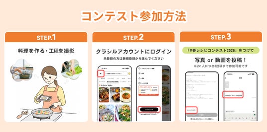 - 応募方法:「クラシル」アプリから写真または動画形式でレシピを投稿し、ハッシュタグ「#春レシピコンテスト2026」を付与