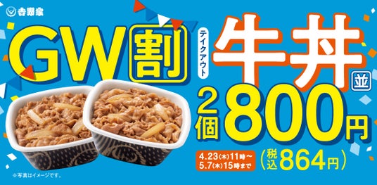 期間:4月23日(木)11時から5月7日(木)15時までの期間内容:テイクアウトの牛丼並盛を2個、3個、4個購入時にキャンペーン価格で提供します。