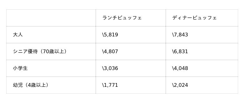 ※3歳以下のお子様は無料です。 ※表記料金は、すべて税金・サービス料を含みます。