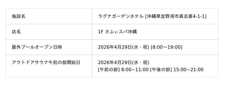 沖縄県宜野湾市のラグナガーデンホテル(株式会社 ラグナガーデンホテル)は、全長53mを誇る屋外プールを 2026年4月29日(水・祝) に今シーズンの営業を開始致します。あわせて、同日よりサウナ施設「さふぃスパ沖縄」のアウトドアサウナ「ラグナサウナ」が午前8時からご利用いただける午前の部の運用を開始します。沖縄の太陽とリゾートの空気をたっぷり感じられるシーズンの幕開けを、どうぞお楽しみに。