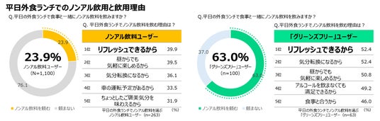 さらに、「平日の外食ランチ」でノンアル飲料を選ぶことがあると答えた人は、ノンアル飲料ユーザーでは23.9%、「グリーンズフリー」ユーザーでは63.0%となりました。その理由としては、いずれのユーザー層でも「リフレッシュできるから」が最も多く挙げられています[図5]。このことから、平日のランチという日常の中のひとときにおいても、気分を切り替えるための選択肢としてノンアル飲料が浸透しつつあることがうかがえます。