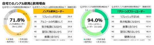次に、シーン別にノンアル飲料の飲用実態を見ると、「自宅」でノンアル飲料を飲む人は、ノンアル飲料ユーザーでは71.8%、「グリーンズフリー」ユーザーでは94.0%にのぼりました。自宅でノンアル飲料を飲む理由としては、いずれのユーザー層でも「リフレッシュするため」が1位となっていますが、「グリーンズフリー」ユーザーではこれに加え、「気分転換になる」「食事と合う」「健康のため」といった、より前向きで多面的な理由が挙げられました[図2]。