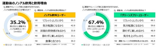 運動後のシーンにおいても、ノンアル飲料の新しい飲用習慣が見られました。週1日以上の運動習慣がある人を対象に、「運動やトレーニング後に、ノンアル飲料を飲むことが以前よりも増えたか」と聞いたところ、「増えた」と回答した人は、ノンアル飲料ユーザーで35.2%、「グリーンズフリー」ユーザーでは67.4%と、約3人に2人に達しました。運動後にノンアル飲料を飲む理由としては、「リフレッシュしたいから」「気分転換になるから」が上位となっており[図4]、運動後のリフレッシュシーンにおいても、ノンアル飲用が選ばれていることがわかります。