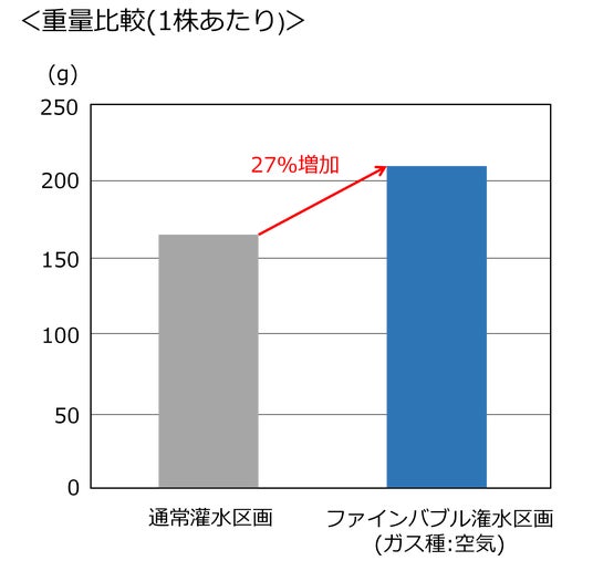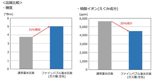 ファインバブルを発生させた農業用水で灌水した区画では、通常灌水と比較して、平均重量が27%増加しました。草丈+6%、根丈+6%と地上部・地下部ともに均等な成長促進が確認され、根圏※4への酸素供給による活性化が収量向上に寄与したと考えられます。また、糖度が31%増加、えぐみ成分(硝酸イオン)が20%減少するなど、食味の大幅な改善も確認しました。