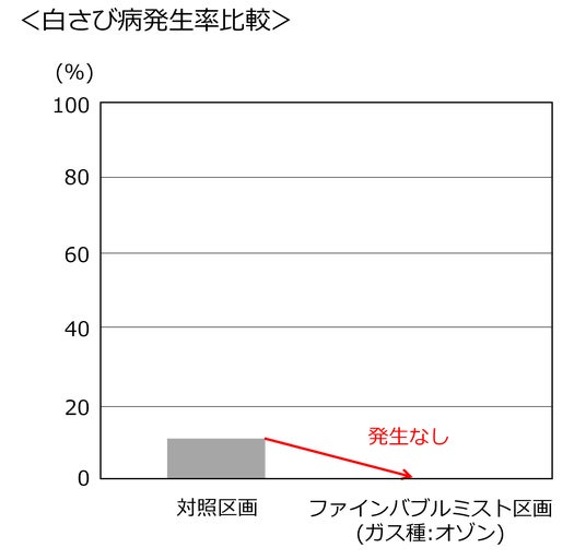 オゾンを取り込んだファインバブルをミスト噴霧した区画では、白さび病の発生は確認されませんでした(ファインバブルミストを使用していない対照区は12.1%)。これは、減農薬栽培における病害予防の新たな選択肢となり得る結果です。