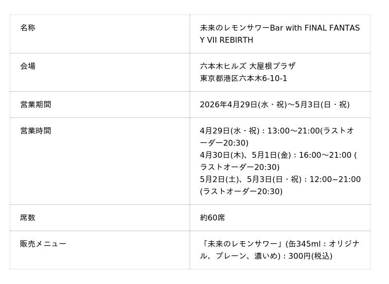 アサヒビール株式会社(本社 東京、社長 松山一雄)は、RTD※1「未来のレモンサワー」と、世界的な人気を誇るRPG(ロールプレイングゲーム)「ファイナルファンタジーVII リバース」とのコラボレーションイベント「未来のレモンサワーBar with FINAL FANTASY VII REBIRTH」を4月29日から5月3日まで、六本木で展開します。