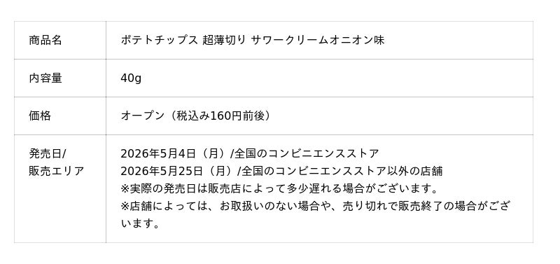 カルビー株式会社(本社:東京都千代田区、代表取締役社長兼CEO:江原 信)は、ジャガイモを極限まで薄くスライスし、シャクシャクッとした軽~い食感が特長の「ポテトチップス 超薄切り」シリーズより『ポテトチップス 超薄切り サワークリームオニオン味』を2026年5月4日(月)から全国のコンビニエンスストアで期間限定発売します。コンビニエンスストア以外の店舗では、同年5月25日(月)から期間限定発売します。