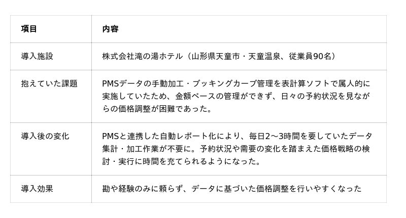 ※省力化ナビのサイト上では製品名・会社名は公開されていませんが、掲載事例が当社製品「Tripboxレベニューダッシュボード」を導入した滝の湯ホテルの事例であること、および製品名・社名の公開については、中小機構より許可をいただいています。