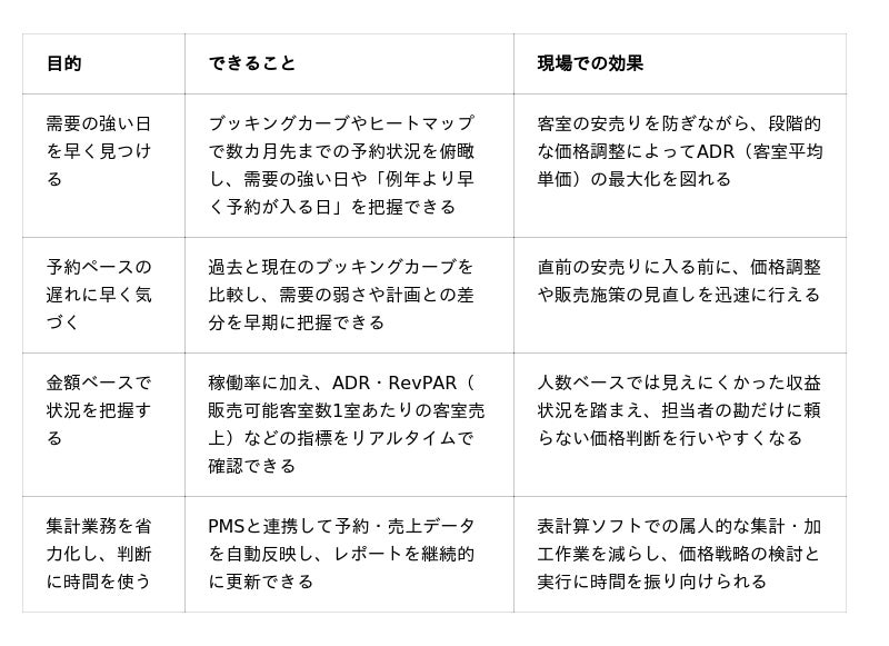 「Tripbox レベニューダッシュボード」は、旅館・ホテルの予約・売上データをもとに、ブッキングカーブやヒートマップ、稼働率・ADR・RevPARなどの主要指標を可視化し、日々の価格調整や販売判断を支援するプロダクトです。PMSとの連携により、これまで表計算ソフトで行っていた集計・加工業務を省力化しながら、需要の強弱や予約ペースの変化を早期に把握し、データに基づくレベニューマネジメントの実践を後押しします。滝の湯ホテルをはじめとする導入施設では、ブッキングカーブや各種指標をもとに需要の強弱を早めに捉えられること、また、手作業の集計負荷を抑えながら価格戦略の検討・実行に時間を充てられることが評価されています。