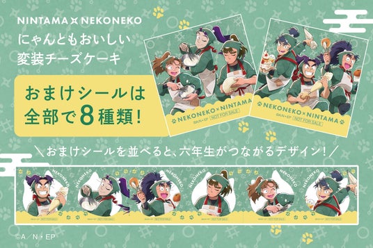 ●『にゃんともおいしい変装チーズケーキ』のおまけシールについて忍たまの六年生がデザインされた全8種のおまけシールがランダムで1枚入っています。「ねこねこ」とのコラボらしいねこ型の背景で、全種類を並べるとつながるデザインがポイント!どのデザインがゲットできるかお楽しみに。
