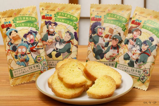 こだわり:定番人気の『シュガーラスク』が「忍たま乱太郎」とのコラボ限定パッケージになって登場!サクッとした食感とトッピングしたシュガーの甘みをお楽しみいただけます。