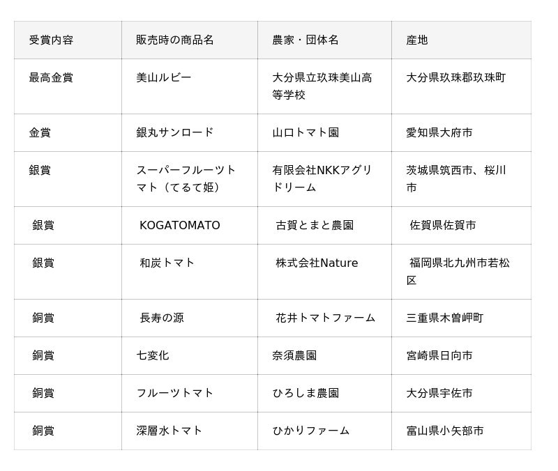 一般社団法人 日本野菜ソムリエ協会(東京都渋谷区、代表理事:福井栄治、以下当協会)は、2026年4月22日(水)に、農産物のさらなる価値向上を目指す青果物の品評会イベントとして「第5回全国トマト(ミディアム)選手権」(以下、本選手権)を開催しました。全国から集まったおいしさ自慢のミディアムトマト全45品の中から、評価員である野菜ソムリエが産地や品種、生産者などの情報をすべて伏せて食味。そのおいしさを審査し、もっともおいしい「トマト」を決定しました。全国青果物選手権では初めて、高校生が育てたトマトが最高金賞を受賞!非常にレベルの高い品評会となりました。