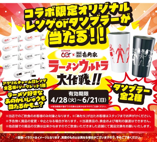 期間中、コラボ限定メニュー「ウルトラーメン」を店内飲食いただいたお客様限定で、その場でオリジナルグッズが当たるスピードくじをご提供いたします。当たりを引いたお客様には賞品として、コラボ限定オリジナルレンゲ全9種、コラボ限定オリジナルタンブラー全2種からランダムで1つプレゼントします。お好きな絵柄をお選びいただくことはできませんので、予めご了承ください。