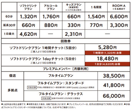 ■SHARE LOUNGE クオーツ心斎橋 料金表