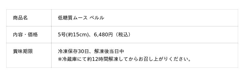 小麦・白砂糖を一切使用しない糖質10g前後(1カットあたり)の低糖質なムースケーキ。糖質を抑えるために羅漢果とオリゴ糖を使用し、ダイエット・美容を考える方におすすめです。マスカルポーネとライチのムースに、清々しい桃とライムのジュレ、すっきりとした酸味と清涼感をプラスしました。エルダーフラワーやバーベナペッパーがふんわりと香り立ち、まるで食後のドリンクやデザートのような、軽やかで上品な味わいに仕上げています。口どけの良いムースとともに広がる、爽やかで奥行きのある香りをお楽しみください。