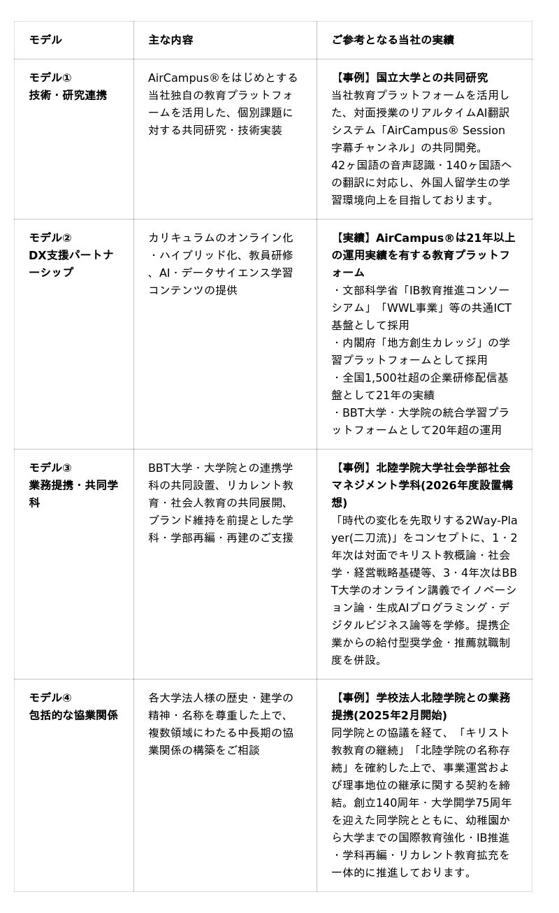 当社は、1998年の創業以来、オンライン完結型の高等教育を主力事業として展開してまいりました。BBT大学・大学院を中心とするオンライン学習によるリカレント事業、アオバジャパン・インターナショナルスクール等の国際教育事業、そして企業向け人材育成事業を三本柱として、幅広い年齢層に教育機会を提供しております。近年は多様な大学・教育機関との連携を通じて、知見と実績を着実に積み重ねており、当社の取り組みは社会的にも注目をいただいております。主な連携実績は以下のとおりです。
