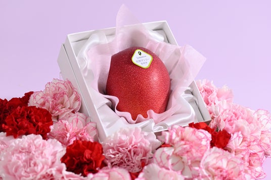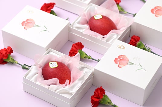 上品な風合いの白い化粧箱には、母の日を彩るカーネーションをあしらい、箱を開けた瞬間には、艶やかに色づいた真っ赤なマンゴーが姿を現します。