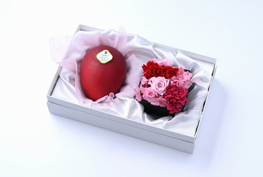母の日の象徴であるカーネーションの鮮やかな赤色と、完熟した宮崎マンゴーの美しい紅色。そのふたつの“赤”を重ね合わせ、感謝の気持ちを華やかに表現しました。