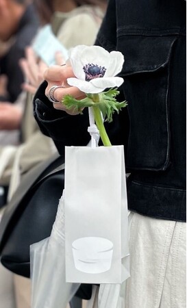 ご購入いただいた一合瓶は、今回初のお披露目となった一合瓶専用袋※に入れて提供。花もお好みのものを一輪選んでいただき、華のある手土産として手元にぶら下げていただきました。