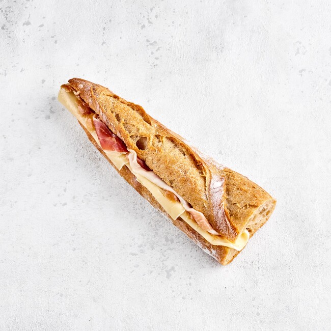 説明:パリッと香ばしいバゲットに、なめらかでクリーミーなフランス産ならではの白カビチーズを贅沢にサンドしました。程よい酸味とマイルドな辛味のある粒マスタードがアクセント。