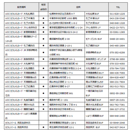 ※喫茶併設店舗にて販売中<参考情報>取り扱い店舗一覧(コーヒー豆の挽き売り業態『UCCカフェメルカード』20店舗、『カフェノバール』2店舗 計22店舗)