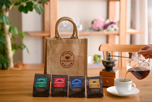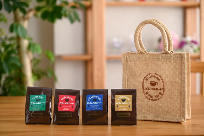 UCCは今年で創業90周年を迎えます。1970年より展開をし始めたのが「UCCカフェメルカード」でした。喫茶店でコーヒーを飲む文化が根強かった当時、UCCは「一人でも多くのお客さまへおいしいコーヒーをお届けしたい」という思いのもと、喫茶店にコーヒー豆の挽き売り業態を併設した「UCCカフェメルカード」を全国に展開しました。そして2023年現在に至るまで50年余りにわたり、お客さまにおいしいコーヒーをお届けし続けています。今回は長年ご愛顧いただいている皆さまに感謝の気持ちを込め、開業当初1970年代の面影を感じていただける昭和の喫茶店のような懐かしい「レトロ」な雰囲気を、ご自宅でもお楽しみいただけるよう、4種類のコーヒー豆(ブルーマウンテンNo.1ブレンド・メルカードブレンド・アメリカンブレンド・イタリアンブレンド各100gずつ)を、オリジナルのバックとともに販売します。また、併設の喫茶コーナーでは純喫茶ならではの『ちょっとレトロなメニュー』をご用意しています。ぜひこの機会に、コーヒーを通じて昭和当時に思いをはせてみてはいかがでしょうか。※喫茶併設店舗は全国16箇所となっております。(一部店舗はドリンクのみ、テイクアウトのみの営業)※提供メニューや販売期間は店舗によって異なりますので、予めご了承ください。●『レトロな珈琲セット~お家でレトロ喫茶気分~』概要