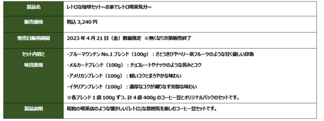 UCC上島珈琲株式会社(本社/兵庫県神戸市、資本金/10億円、社長/朝田文彦、以下UCC)は、UCCが直営で展開するコーヒー豆挽き売り業態「UCCカフェメルカード」・「カフェノバール」22店舗にて、昭和の喫茶店のような「レトロ」な雰囲気をお届けするコーヒー豆セット4種類が入った『レトロな珈琲セット~お家でレトロ喫茶気分~』を4月21日(金)に新発売します。あわせて併設の喫茶コーナーにて、「プリン」「ミルクレープ」「ウィンナーコーヒー」「メロンソーダ」など懐かしさや親しみを感じる『ちょっとレトロなメニュー』もご提供します。
