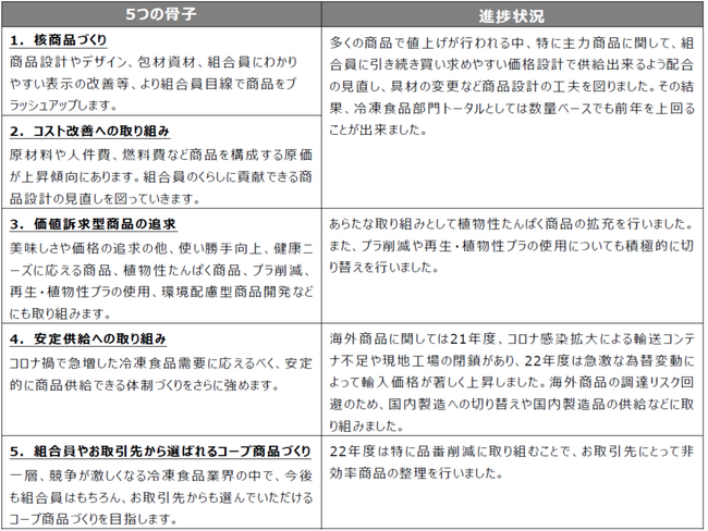 2022年度に設定した冷凍食品5つの骨子を引き続き今年度も踏襲し、商品力強化に努めてまいります。