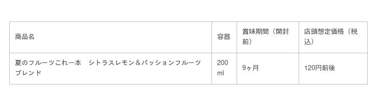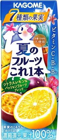 「夏のフルーツこれ一本 シトラスレモン&パッションフルーツブレンド」は、シトラスレモンやパッションフルーツ等の7種類の果実をブレンドした夏限定の100%果実ミックスジュースです。シトラスレモンのほどよい香りを楽しみながら、果実のミネラル(カリウム)やたっぷりビタミンC・B2・B12が摂れます。砂糖・甘味料不使用で、朝食時やリフレッシュしたい時におすすめです。