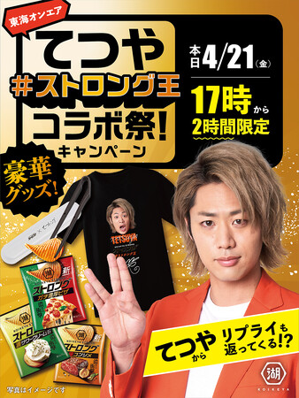 湖池屋 コイケヤ【公式】(@koikeya_cp)をフォローしていただいた上で、本日17時に発信されるキャンペーンツイートに、「#ストロング王」をつけて“あなたの最強エピソード”を引用リツイートしてください。てつやさんからリプライが返ってくる(!?)かも