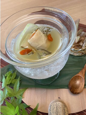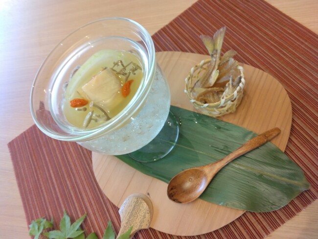 湯河原は“さがみの小京都”とも呼ばれること、また夏をイメージするアイテムなことから、この器を選択。氷の入ったガラスの器も涼しげな様子を演出しております。