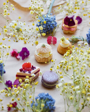 まず、穏やかなカモミールのベースにメロン、パイナップル、ピンクグレープフルーツジュースを重ねたフローラルでフルーティなウェルカムドリンクからスタートします。子供時代のパトリックは、ラズベリー、ヴァイオレット、グレナデンシロップで作られたスイスの赤いスパークリングソーダが好きでした。シェフの思い出のドリンクは、バニラベイクドチーズケーキ、ラズベリー、ビスキュイ、バイオレットレットフレーバーのクリーム、ラズベリーとグレナデンのジュレで複雑に構成されたヴァイオレット&ラズベリーチーズケーキとして表現されています。次の目的地は、ラベンダーとアプリコットマカロンで表現した花が咲き誇る伝統的なスイスの庭です。若き日のパトリックの心を魅了したラベンダーに愛らしいオマージュを添えて、ラベンダーとホワイトチョコレートのガナッシュ、アプリコットマーマレードとセミドライアプリコットとともに美しいマカロンを作りました。カモミールとレモンハニーシューはカモミールのクレーム・ディプロマット、レモンコンフィ、ハニーシャンティクリームとエルダーフラワーのジュレが一体となっています。最初の3層は冬から春へと移り変わりの季節に、家庭でよく作られるスイスの伝統的な子供用のドリンクに着想を得ています。エルダーフラワーがフレッシュなアクセントとなっています。フローラルのテーマはパトリックのフローラルレイヤータルトへと続きます。毎朝、フォーシーズンズに届けられるその日のお花によって、薔薇または蘭のジュレが織り成すこの素晴らしいタルトは、ラズベリー、エディブルフラワーで彩られ、スイスの豊かな春の情景をお届けします。そして、次のオレンジフラワーフィナンシェにはピンクグレープフルーツのジュレとオレンジフラワーをミックスしたホワイトチョコレートのシャンティイクリームが使われています。緑豊かな季節のティータイムに定番のスコーンは、やはりこの季節ならではのひねりをきかせて、オレンジコンフィとオレンジフラワーのアイシングがほどこされています。