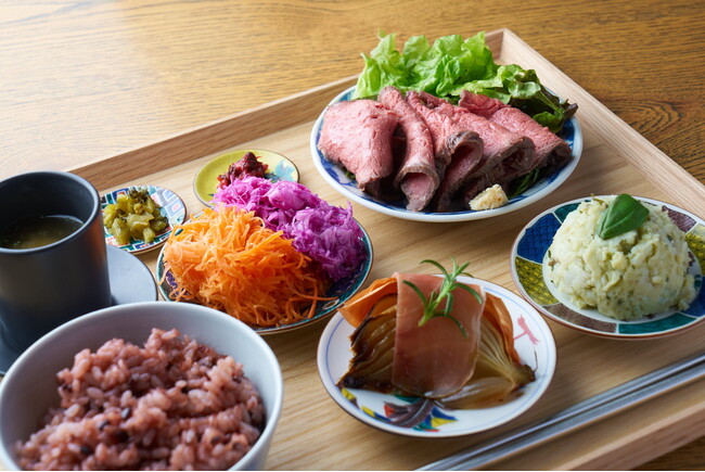 黒米、おみそ汁、お野菜、そしてメイン料理。体にも心にもイイ食事をお楽しみください。お皿は九谷焼を使用し、目にもオイシイ。1日に必要とされる1/3量(5.7g)の食物繊維が摂取できるプレートです。おみそ汁は、ダイエットや美肌など女性にとって嬉しい効果が期待できると話題の「長生きみそ汁」を特製味噌で仕上げたオリジナル。メイン料理は8種類の中からお選び頂けます。