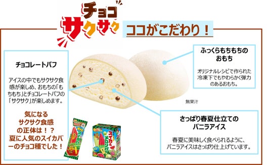 - チョコレートパフはアイスの中でもサクサク食感で、おもちの「もちもち」とチョコレートパフの「サクサク」の2つの食感を楽しむことができます。