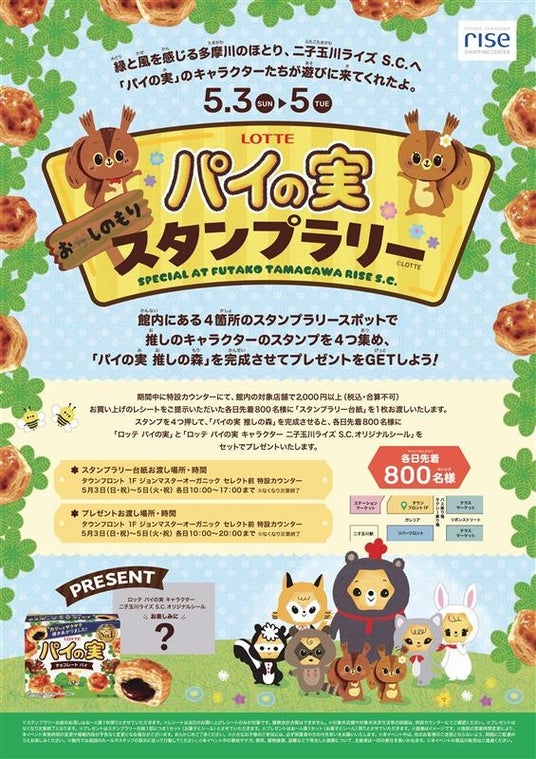 現在展開中の「パイの実 おしの森」プロジェクトの一環として、推しのキャラクタースタンプを完成させて、プレゼントゲットを目指す「パイの実 おしの森スタンプラリー」を2026年5月3日(日)~5月5日(火)の期間、二子玉川ライズ・ショッピングセンターにて開催します。「パイの実 おしの森」プロジェクトはパイの実のこれまでパッケージや絵本の中などで親しまれてきた世界観を、さらに進化させるため、豪華クリエイター陣とタッグを組み、新たに世界観を構築しました。現代の「推し活」カルチャーをモチーフにした、尊すぎるパイの実愛が溢れる物語「おしの森」をぜひ二子玉川ライズ・ショッピングセンターでお楽しみください。