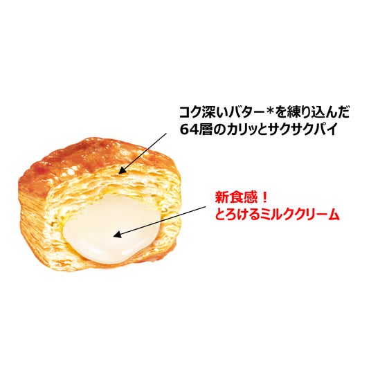 - コク深いバター(*)を練り込んだ64層のサクサクパイに、とろけるミルククリームをとじ込めた一粒スイーツです。
