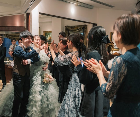 また、あえて「高砂席」を設けないレイアウトや円形の会場設計により、新郎新婦との距離が近く、自然なコミュニケーションが生まれます。