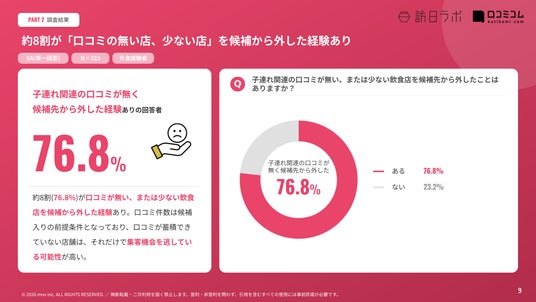 飲食店選びにおける口コミの影響度を調査したところ、子連れ層の約7割(69.2%)が店選び時に口コミを確認すると回答しました。さらに、子連れ関連の口コミが無い・少ない飲食店を候補から外した経験がある消費者は76.8%にのぼり、口コミの蓄積そのものが「選ばれる店」の前提条件になっていることが明らかとなりました。