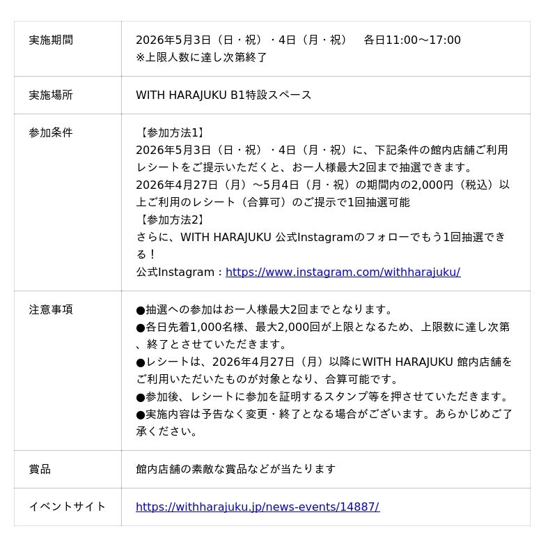 本イベントでは、WITH HARAJUKU 館内店舗のご利用レシート(税込2,000円以上)のご提示で、館内店舗の素敵な商品などが当たる抽選にチャレンジできます!今年のGWは、原宿であそんで運だめしにチャレンジしてください。