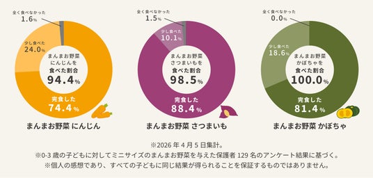 【まんまお野菜】のミニサイズの試供品を用いたモニターアンケートを実施した結果、0-3歳の約94.4%が【まんまお野菜】を食べたというデータを取得しました。