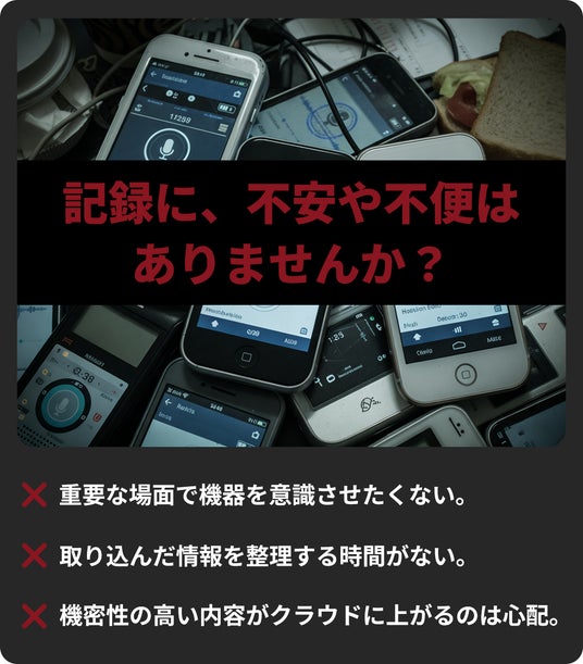 録音した音声は、専用アプリが瞬時に文字起こしと要約を生成。議事録作成の手間を根本から省きます。