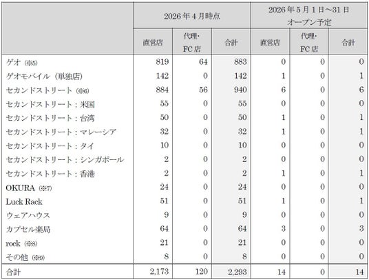 新たに、セカンドストリート9店舗、ゲオモバイル1店舗、ラックラック1店舗、カプセル楽局3店舗の合計14店舗が2026年5月にオープンします。