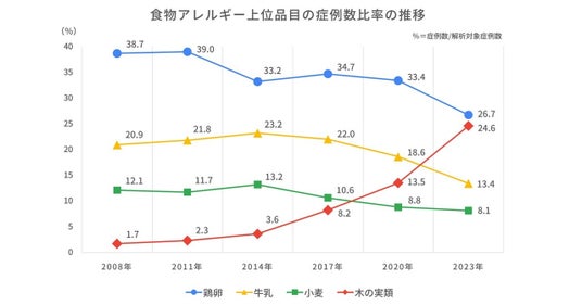 2026年4月1日の食品表示基準改正により、カシューナッツが特定原材料(表示義務)(※1)へ移行され、ピスタチオが特定原材料に準ずるもの(推奨表示)として新たに追加されました。この背景には木の実類アレルギーの急増があります。消費者庁の調査では、2023年は木の実類アレルギーの症例数比率が24.6%となり、主要アレルゲンである鶏卵に迫る勢いです。木の実類アレルギーは、他のアレルギーと比較して自然寛解(※2)しにくく、微量でも重篤な症状を誘発する恐れがあるため、より厳格な情報管理が求められています。(※3)