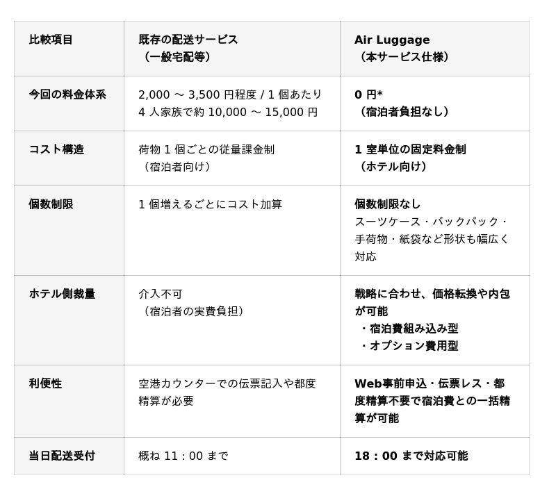 本サービスは、従来の「荷物1個単位」の従量課金ではなく、「 1 室単位の固定料金(個数無制限)」というB2Bモデルを採用しています。これにより、各施設は自社のブランド戦略に合わせた自由な提供形態を選択可能です。