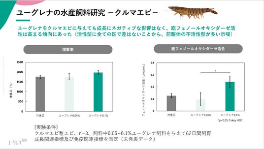 水産分野では国立大学法人鹿児島大学水産学部 (鹿児島県鹿児島市、学長:佐野輝)との共同研究として、カンパチとクルマエビにユーグレナを配合した飼料の給餌試験を実施したところ、いずれにおいても成長にネガティブな影響は認められず、カンパチでは自然免疫の指標である血液中リゾチーム活性が、クルマエビでは感染防御に関わる総フェノールオキシダーゼ活性が上昇しました。