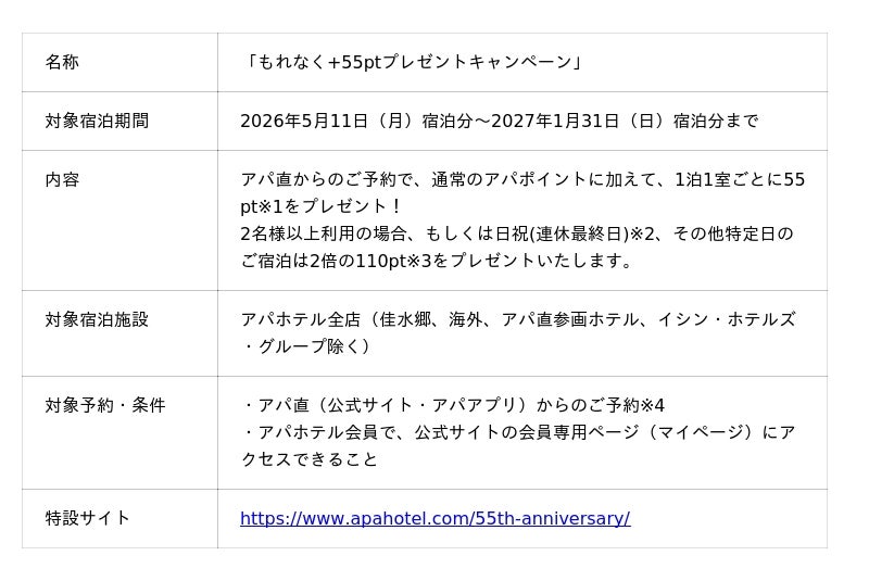 [内容] 55周年を記念し、期間中の入会者抽選で100名様に、アパホテルのご宿泊で使える
