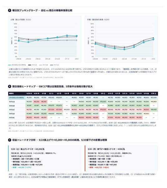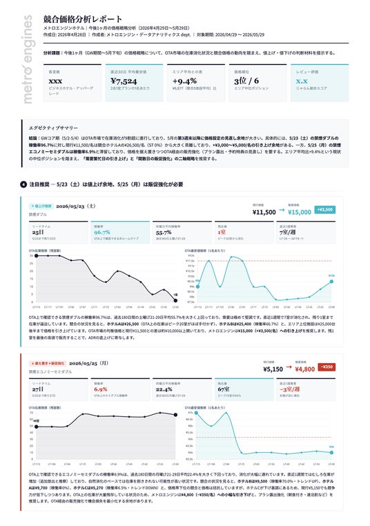 レポートでは、競合施設との稼働・価格のポジショニング比較や、需要に対する価格設定の妥当性などを多角的に分析し、自施設の現状と改善余地を可視化いたします。実務に直結する具体的な示唆を得られる内容となっており、自社のレベニューマネジメントを見直す第一歩としてご活用いただけます。