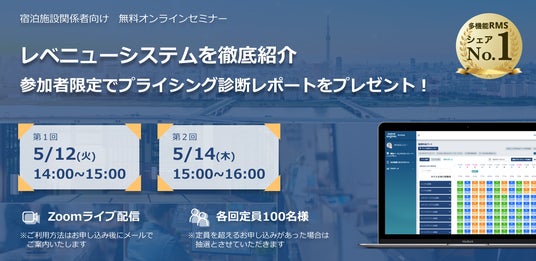 宿泊業界を中心にビッグデータとAIを活用したレベニューマネジメントツールを提供するメトロエンジン株式会社(本社:東京都品川区、代表取締役CEO:田中良介、以下メトロエンジン)は、2026年5月12日(火)および5月14日(木)の2日程で無料オンラインセミナーを開催いたします。本セミナーでは、メトロエンジンレベニューシステムの概要をご紹介するとともに、参加者特典として「宿泊施設向けプライシング診断レポート」を無料で提供いたします。競合施設との比較や需要に対する価格設定の妥当性を可視化し、収益改善のヒントを得られる内容となっております。
