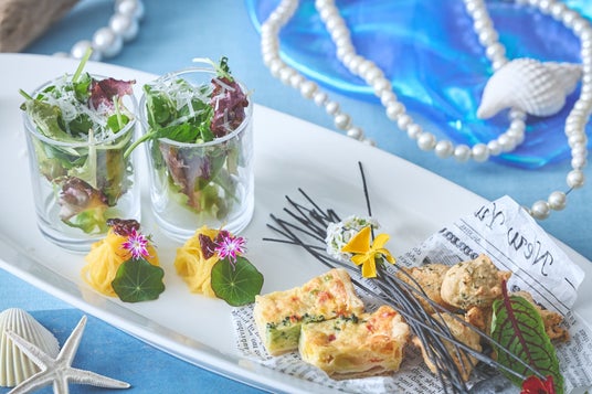 コース料理は「玉葱の岩塩包み焼き」から始まり、爽やかなオレンジが香るキャロットラぺ、モッツァレラチーズを忍ばせたあおさ海苔のゼッポリーニ、食感の楽しいイカ墨そうめんフリットなどの「アンティパストミスト(前菜5種類の盛り合わせ)」、自家製のフォカッチャと共に楽しめる彩り鮮やかな「夏野菜のアヒージョ」、メイン料理はイタリア産トマトで柔らかく煮込んだ牛肉に昆布の隠し味が深いコクと旨味を引き出す「イタリアトマトの牛肉ブレゼ」、貝殻の形のショートパスタ「コンキリエ」を使用した「タスマニアサーモンのレモンクリームパスタ」、コース料理の締めくくりには澄み渡る青い海をイメージし、ホワイトチョコの甘みとクリームチーズの爽やかさが調和した、目にも涼やかなデザート「マーレ ブルー」をご用意いたしました。